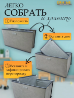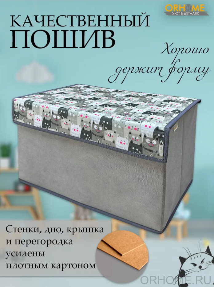 Многофункциональный детский кофр для хранения – настоящий помощник в организации пространства детской комнаты! Этот стильный органайзер, украшенный милым принтом с котиками на сером фоне, не только поможет приучить ребёнка к порядку, но и станет ярким акцентом в интерьере детской. Размеры детской коробки для хранения идеально продуманы: 50х30х30 сантиметров – достаточно вместительно для игрушек и детских вещей, но при этом не занимает много места в комнате. Удобная откидная крышка на липучке обеспечивает лёгкий доступ к содержимому и надёжно защищает игрушки от пыли, а также позволяет ребёнку самостоятельно открывать и закрывать коробку. Главная особенность нашего короба – съёмная перегородка на липучках, которая даёт возможность гибко организовать внутреннее пространство. Ваш малыш сможет разделить коробку на секции для разных видов игрушек или убрать перегородку, когда потребуется больше места для крупных предметов. Изготовленный из качественных и безопасных материалов, органайзер прослужит долгое время, сохраняя свой привлекательный внешний вид. Коробка для хранения легко очищается от пыли и загрязнений, что особенно важно в детской комнате. В нашем органайзере можно хранить игрушки, книжки, творческие принадлежности, одежду для игр или любые другие детские вещи. Благодаря продуманной конструкции, кофр легко помещается в шкафу, на полке или в любом удобном месте детской комнаты. Наш короб для хранения поможет не только организовать пространство, но и научить ребёнка аккуратности и порядку в игровой форме. Яркие котики на сером фоне создадут уютную атмосферу и будут радовать малыша каждый день. Компактные размеры и удобная конструкция делают использование коробки максимально комфортным для ребёнка. Превратите хранение игрушек в увлекательное занятие, а нашу практичную коробку для хранения сделайте верным помощником в организации детской комнаты. Создайте вместе с ребёнком систему хранения, которая будет радовать вас обоих!