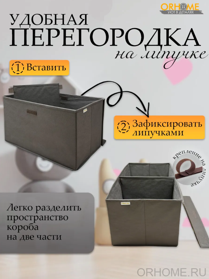 Многофункциональный детский короб для хранения – настоящий помощник в организации пространства детской комнаты! Этот стильный органайзер, украшенный милым принтом с котиками на сером фоне, не только поможет приучить ребёнка к порядку, но и станет ярким акцентом в интерьере детской. Размеры детской коробки для хранения идеально продуманы: 50х30х30 сантиметров – достаточно вместительно для игрушек и детских вещей, но при этом не занимает много места в комнате. Удобная откидная крышка на липучке обеспечивает лёгкий доступ к содержимому и надёжно защищает игрушки от пыли, а также позволяет ребёнку самостоятельно открывать и закрывать коробку. Главная особенность нашего короба – съёмная перегородка на липучках, которая даёт возможность гибко организовать внутреннее пространство. Ваш малыш сможет разделить коробку на секции для разных видов игрушек или убрать перегородку, когда потребуется больше места для крупных предметов. Изготовленный из качественных и безопасных материалов, органайзер прослужит долгое время, сохраняя свой привлекательный внешний вид. Коробка для хранения легко очищается от пыли и загрязнений, что особенно важно в детской комнате. В нашем органайзере можно хранить игрушки, книжки, творческие принадлежности, одежду для игр или любые другие детские вещи. Благодаря продуманной конструкции, кофр легко помещается в шкафу, на полке или в любом удобном месте детской комнаты. Наш короб для хранения поможет не только организовать пространство, но и научить ребёнка аккуратности и порядку в игровой форме. Яркие котики на сером фоне создадут уютную атмосферу и будут радовать малыша каждый день. Компактные размеры и удобная конструкция делают использование коробки максимально комфортным для ребёнка. Превратите хранение игрушек в увлекательное занятие, а нашу практичную коробку для хранения сделайте верным помощником в организации детской комнаты. Создайте вместе с ребёнком систему хранения, которая будет радовать вас обоих!