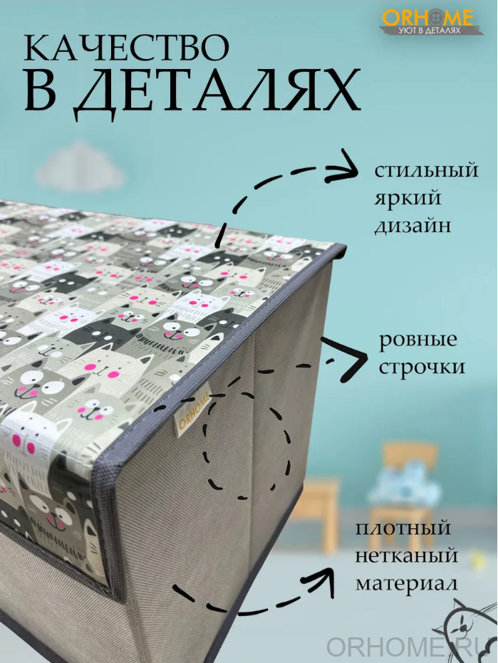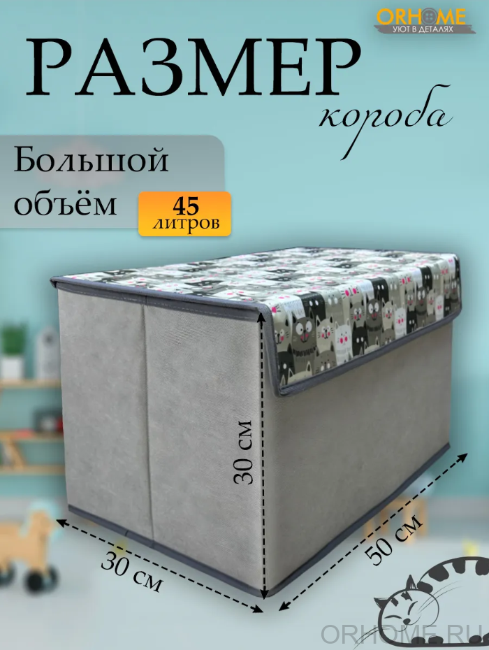 Многофункциональный детский кофр для хранения – настоящий помощник в организации пространства детской комнаты! Этот стильный органайзер, украшенный милым принтом с котиками на сером фоне, не только поможет приучить ребёнка к порядку, но и станет ярким акцентом в интерьере детской. Размеры детской коробки для хранения идеально продуманы: 50х30х30 сантиметров – достаточно вместительно для игрушек и детских вещей, но при этом не занимает много места в комнате. Удобная откидная крышка на липучке обеспечивает лёгкий доступ к содержимому и надёжно защищает игрушки от пыли, а также позволяет ребёнку самостоятельно открывать и закрывать коробку. Главная особенность нашего короба – съёмная перегородка на липучках, которая даёт возможность гибко организовать внутреннее пространство. Ваш малыш сможет разделить коробку на секции для разных видов игрушек или убрать перегородку, когда потребуется больше места для крупных предметов. Изготовленный из качественных и безопасных материалов, органайзер прослужит долгое время, сохраняя свой привлекательный внешний вид. Коробка для хранения легко очищается от пыли и загрязнений, что особенно важно в детской комнате. В нашем органайзере можно хранить игрушки, книжки, творческие принадлежности, одежду для игр или любые другие детские вещи. Благодаря продуманной конструкции, кофр легко помещается в шкафу, на полке или в любом удобном месте детской комнаты. Наш короб для хранения поможет не только организовать пространство, но и научить ребёнка аккуратности и порядку в игровой форме. Яркие котики на сером фоне создадут уютную атмосферу и будут радовать малыша каждый день. Компактные размеры и удобная конструкция делают использование коробки максимально комфортным для ребёнка. Превратите хранение игрушек в увлекательное занятие, а нашу практичную коробку для хранения сделайте верным помощником в организации детской комнаты. Создайте вместе с ребёнком систему хранения, которая будет радовать вас обоих!